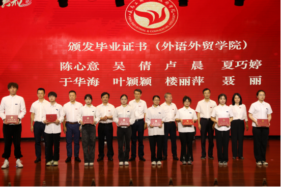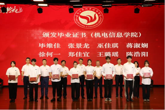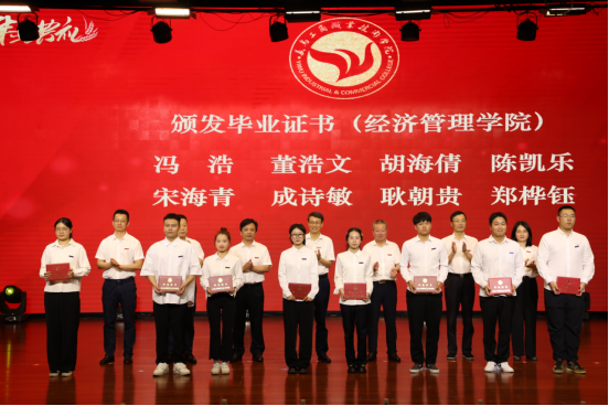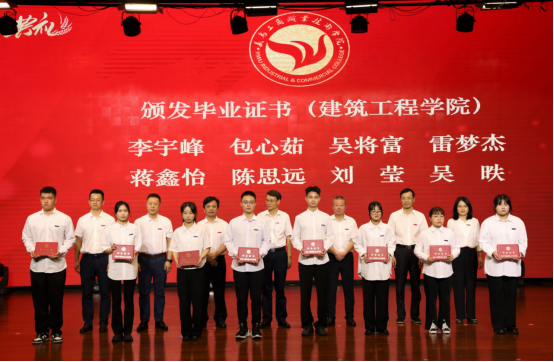 李昌祖书记、马广院长为省级优秀毕业生和金穗学子颁发荣誉证书,党委副书记叶斯源宣读表彰文件,校领导班子成员为毕业生代表颁发毕业证书。
