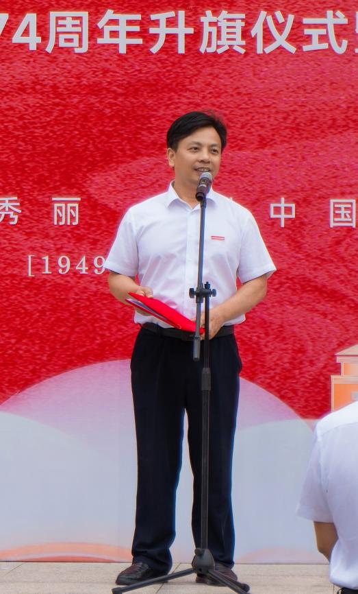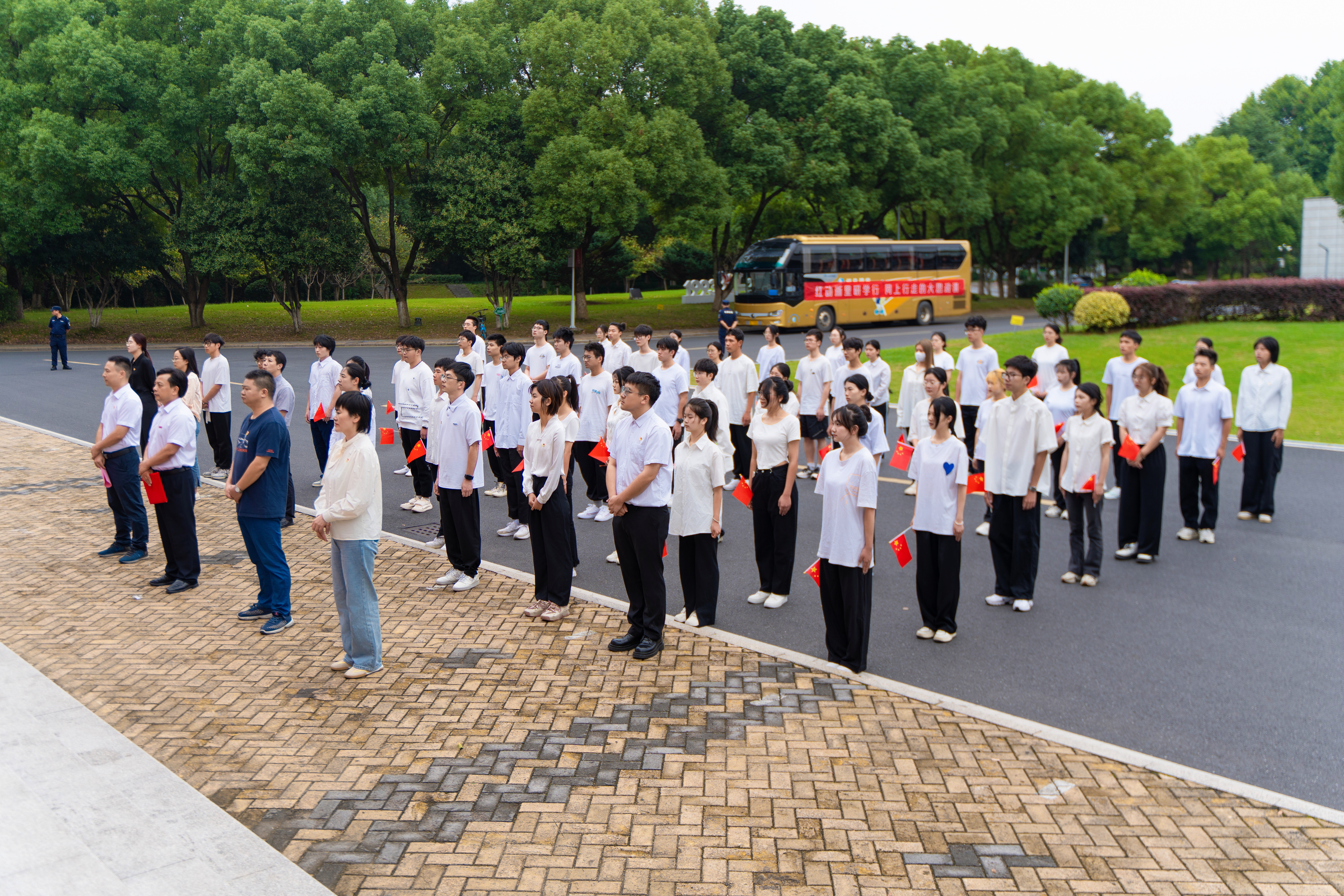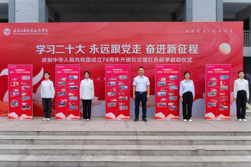 今天,义乌工商职业技术学院举行主题升旗暨红色研学启动仪式,献礼中华人民共和国74周年华诞。校党委副书记叶斯源,办公室、宣传部、学工部、团委等相关职能部门负责人,青年教师代表、学生骨干代表参加活动。