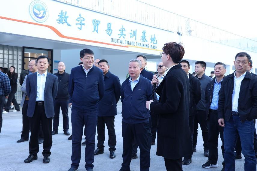 实训基地相关负责人结合义乌市先行先试的国际贸易系列改革政策与举措,介绍了基于数字贸易产业链,外语外贸学院与众多知名企业联合共建的“一基地、三中心、多场域”产教融合型实训基地及校内外实习实践形式,重点参观了集教学、展示与培训等多功能为一体的数字贸易综合实训室及多语种跨境直播中心。
