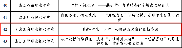 近日,教育部公布2024年度高校思想政治工作质量提升综合改革与精品建设项目遴选结果。我校申报的《课堂+学社:大学生心理适应教育的创新实践》入选2024年度高校学生心理健康教育指导典型案例,实现了学校在该项目申报立项的新突破。另外,《创在义工商:基于大学生“麦穗”成长计划的实践育人模式》入选浙江省思想政治工作精品项目。