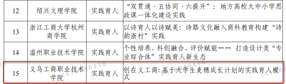 《创在义工商:基于大学生“麦穗”成长计划的实践育人模式》的麦穗计划以思想引领为核心,以“尚德”“崇文”“创业”“立身”为教育内容,通过科学设计百门精品课程,严格落实千分银行制度,构建以“创”统领的三年一贯制“大思政”育人格局,实现万名学子共成才。近年来,学校以学生的全面发展为价值旨归,以麦穗计划为牵引,系统推进人才培养体系改革,建立了“以生为本”为宗旨、“进阶培养”为时间轴、“千分银行”为尺度、“成长图谱”绘制为进路的“全维度、立体化”双创人才培养体系,学校人才培养能力和学生发展质量显著增强。学校基于麦穗计划构建的双创教育评价机制,入选浙江省教育厅教育评价改革典型案例;《学生创新创业评价改革》项目,入选浙江省深化新时代教育评价改革试点项目。
