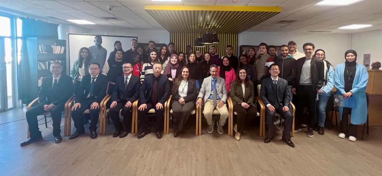 在中国驻摩洛哥大使馆,代表团受到中国驻摩洛哥大使馆公使衔参赞周志成的亲切接见,樊曜详细介绍了学校与蒙迪亚波利斯大学的合作情况,两校共建摩洛哥义乌商学院开展“2+1”联合培养专业学生,助力中摩经贸发展,培养国际化人才,汇报了摩洛哥义乌商学院的工作目标和发展规划。周志成高度赞赏我校成立摩洛哥义乌商学院,为摩洛哥培养高素质国际商贸人才,促进中摩经贸发展,为摩洛哥的经济社会发展贡献中国职业教育力量。周志成还详细介绍了摩洛哥的历史发展和经济现状,并希望我校发挥区位优势和办学优势,进一步提高摩洛哥义乌商学院办学质量,发挥职业教育优势,开展“中文+职业技能”培训,助力中摩经贸往来和人文交流。