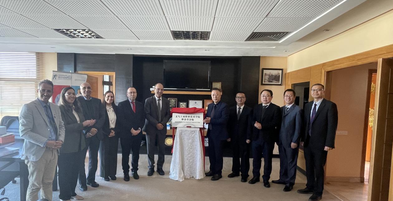 代表团赴摩洛哥蒙迪亚波利斯大学参加我校第一所海外分校——摩洛哥义乌商学院揭牌仪式。摩洛哥义乌商学院合作共建伙伴摩洛哥蒙迪亚波利斯大学校长穆罕默德·巴尔卡维携该校教学、管理团队共同揭牌。代表团还参加了摩洛哥义乌商学院2023级国际经济与贸易专业新生见面会,樊曜代表学校给新生致以热烈的欢迎和亲切的问候,学校招生就业、国际交流等相关部门、学院向摩洛哥义乌商学院新生宣讲学校办学特色和支持政策。