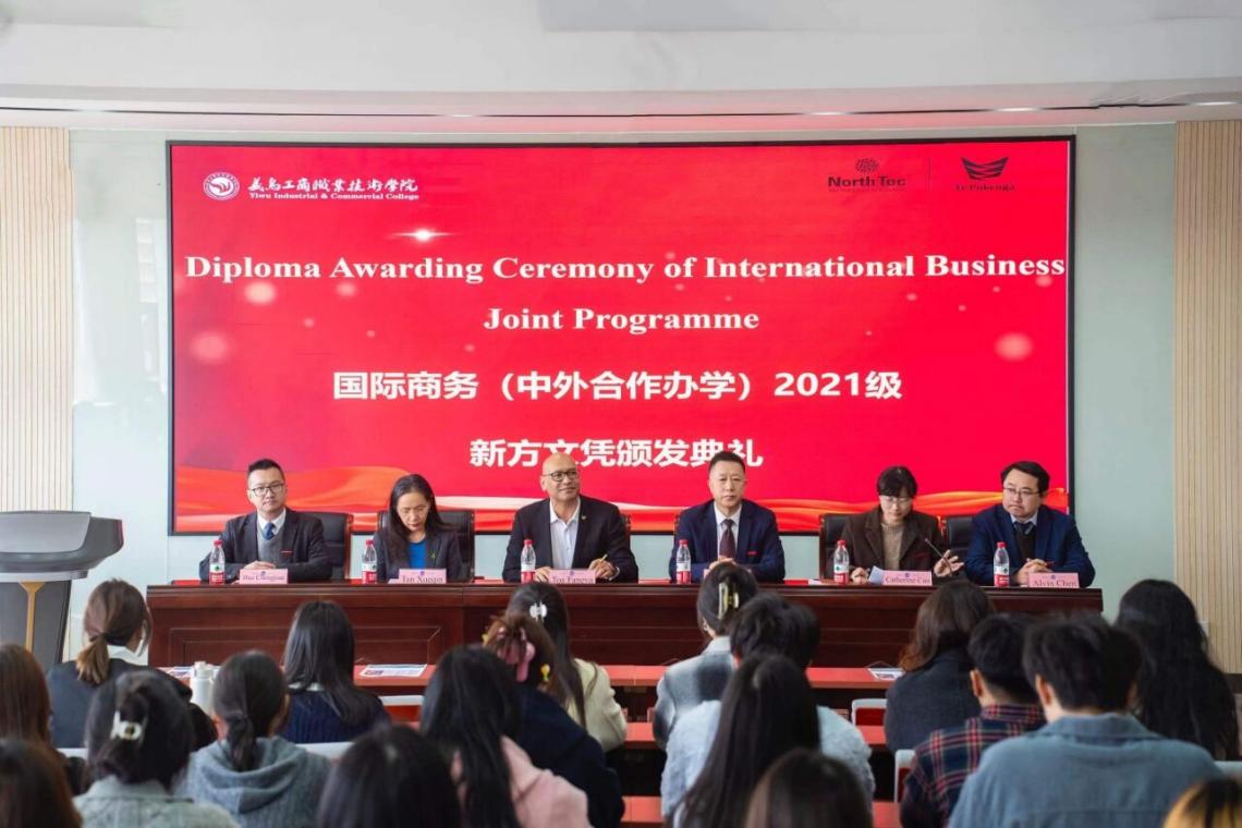 学校还举行了国际商务(中外合作办学)项目学生见面会暨2021级毕业生新方文凭颁发典礼。