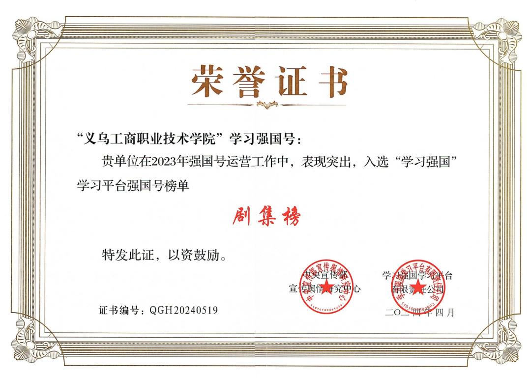 4月22日,为鼓励先进,共同进步,“学习强国”发布学习强国号“耕耘榜”“热度榜”“人气榜”“创意榜”“剧集榜”五大榜单,评选出100家强国号,“义乌工商职业技术学院”强国号推出的《跨境电商实用英语》荣登强国号百强榜剧集榜单,为唯一入选的高职院校强国号。