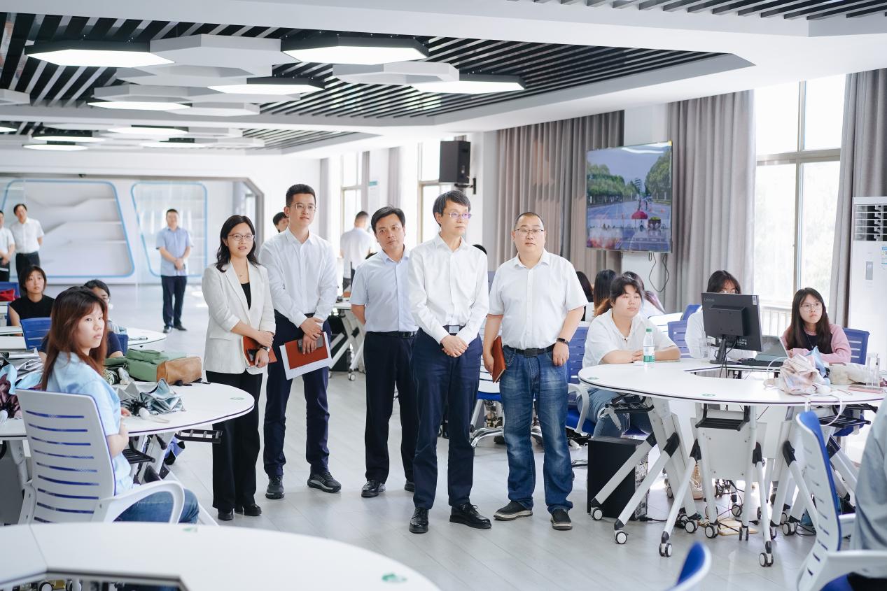 与会人员实地走访了人文旅游学院实训室和外语外贸学院数字贸易实训基地。在人文旅游学院的新媒体综合实训室,大家观看了AI智慧旅游平台的景区全景实训系统,实现景区720度“云”游览;在餐厅实训室,大家观看了酒店管理与数字化运营专业学生的调酒技能展示。党委书记李昌祖与技能展示学子进行了亲切交流,详细询问了她们在校的学习情况、生活情况和未来规划。他嘱咐同学们要认真学习,加强技能练习,用技能反馈家庭、感恩父母。