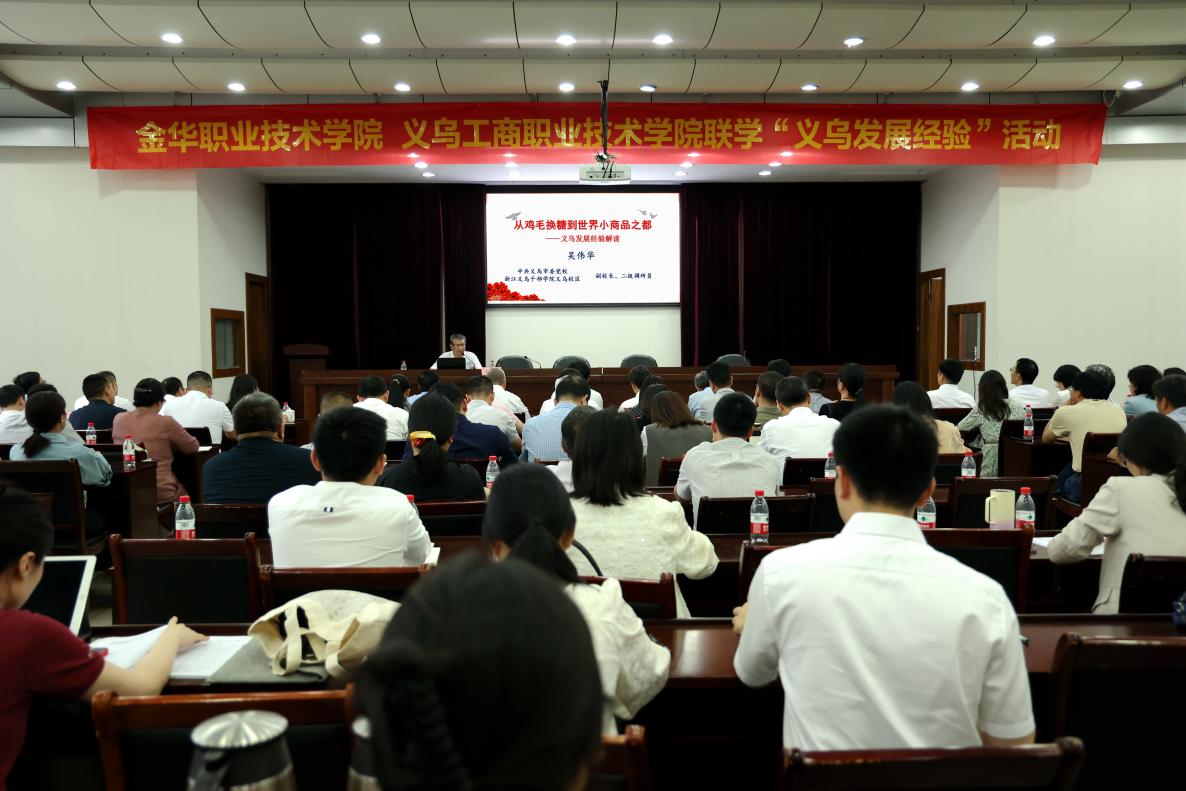 5月22日下午,学校举行党委理论学习中心组2024年度第6次(扩大)学习会,并与金华职业技术学院党委联合开展党委理论学习中心组联学活动,专题学习“义乌发展经验”。金、义两校党政领导班子成员出席会议,两校中层正职及相关工作人员共计100余人参加会议。中共义乌市委党校副校长吴伟华作“义乌发展经验”专题解读。院长、党委副书记马广主持会议。