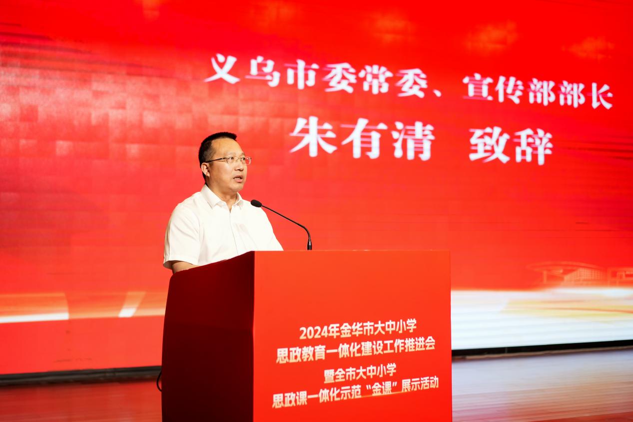 朱有清对与会领导、嘉宾的到来表示热烈欢迎,对大家给予义乌教育事业发展的关心和支持表示衷心的感谢。他指出,作为全国知名的商贸城市,义乌不仅在经济建设上取得了举世瞩目的成就,更在推进思想政治教育工作领域积极探索,义乌市委、市政府将立足习近平总书记关于教育的重要论述,进一步通过提高政治站位、加强顶层设计、加强统筹协调以更大力度、更实举措推进全市大中小学思政教育一体化建设。