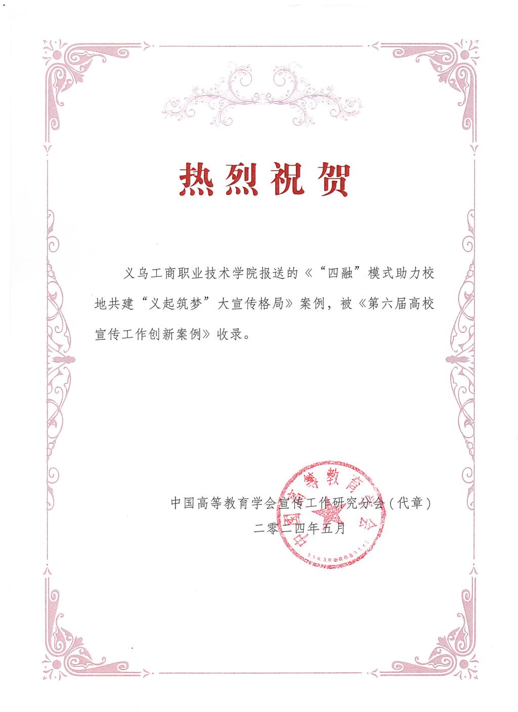 6月14日-16日,中国高等教育学会宣传工作研究分会在大连理工大学召开。来自全国各地的理事、会员、新闻媒体,以及各高校、教育领域的近180名专家学者齐聚一堂,以“担当新时代新的文化使命”为主题深入学习贯彻习近平文化思想,展现新时代高校宣传思想文化工作新气象新作为。会上公布了第六届高校宣传工作创新案例28项,学校报送的《“四融”模式助力校地共建“义起筑梦”大宣传格局》案例入选并被收录《第六届高校宣传工作创新案例》,成为2项来自高职院校的案例之一。