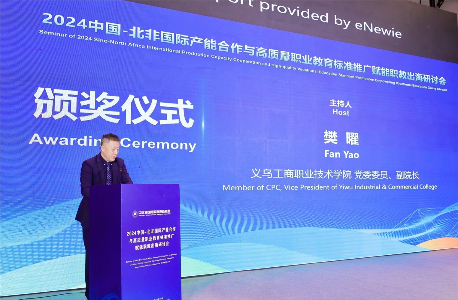 近日,中国-北非国际产能合作与高质量职业教育标准推广赋能职教出海研讨会在天津成功举办。摩洛哥职业教育与就业发展办公室总干事,摩洛哥王国驻我国大使,中国教育国际交流协会领导,摩洛哥、突尼斯、阿尔及利亚、埃及等国家政府领导和高校校长,国内院校领导、专家等百余位代表应邀参会。研讨会由中北非国际教育创新联盟、义乌工商职业技术学院等高校联合主办,党委委员、副院长樊曜出席会议并主持颁奖环节。
