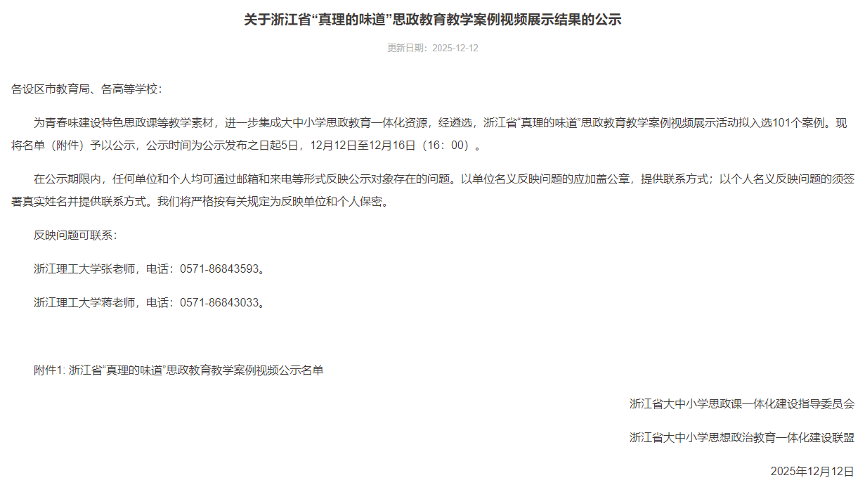 关于浙江省“真理的味道”思政教育教学案例视频展示结果的公示