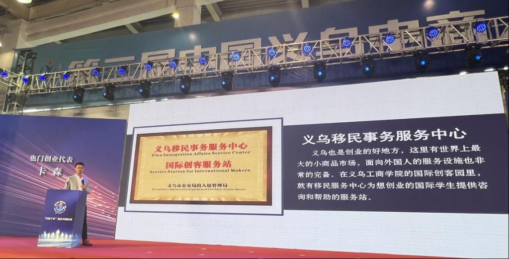 在“百校千企”校企对接活动中的青年创业成功经验分享,国际教育学院创业学生代表卡森,作为两位国际青年代表之一,分享了自己来华来义学习和从事电商直播创业的体验和感悟,积极赞赏义乌市政府为打造一流营商环境、向中外居民提供优质平等创业就业机遇所作努力,欢迎更多外国朋友来义创业就业,将义乌小商品和义乌故事带到世界各地。