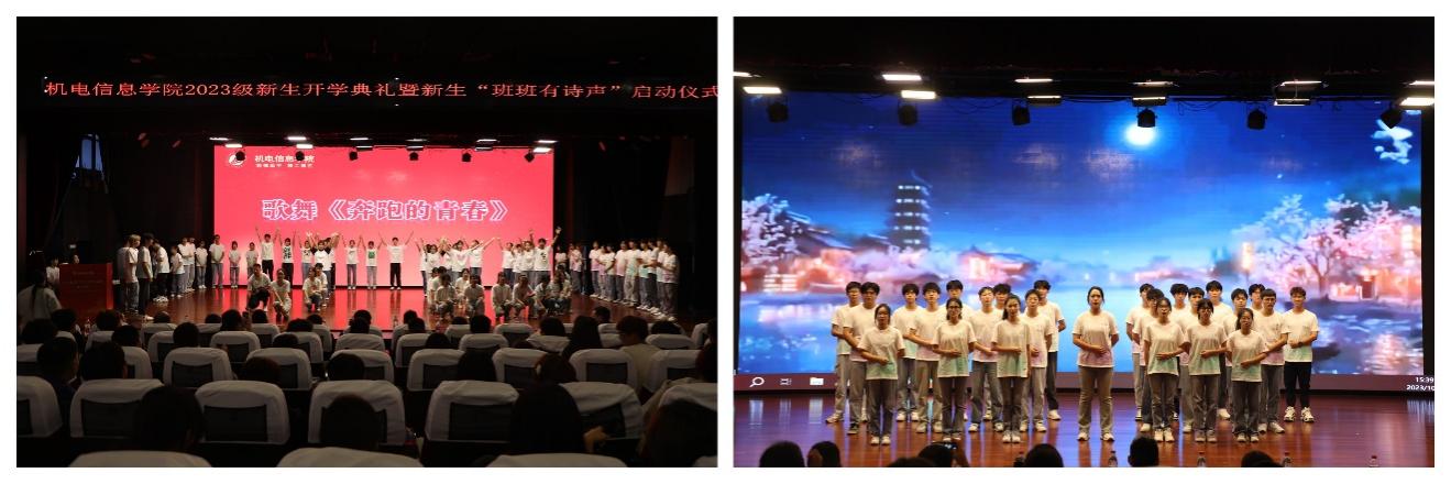 典礼伊始,全体起立,奏唱国歌。暖场活动“开学及军训剪辑视频”记录了新生们入学、军训和班级活动的青春剪影。学院精心制作的办学30周年成果展示片带领师生重温了机电信息学院发展历程及成果成效,诗朗诵《将进酒》和歌舞《奔跑的青春》等文艺表演展示了机电学子们的朝气蓬勃和青春力量。