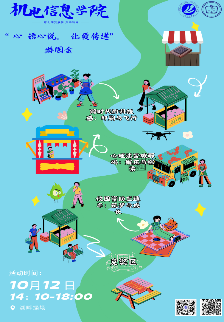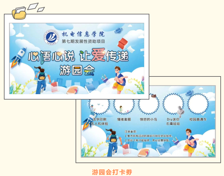 本次游园会在湖畔操场举行,目的是让同学们走出寝室,近距离感受青春的气氛。此次活动集合了印刷专业知识、心理建设专栏、资助相关政策等元素,以多元的视角、新颖的形式,让参与的同学们在轻松的活动氛围中感受机电特色专业、心理素质拓展、资助育人理念。
