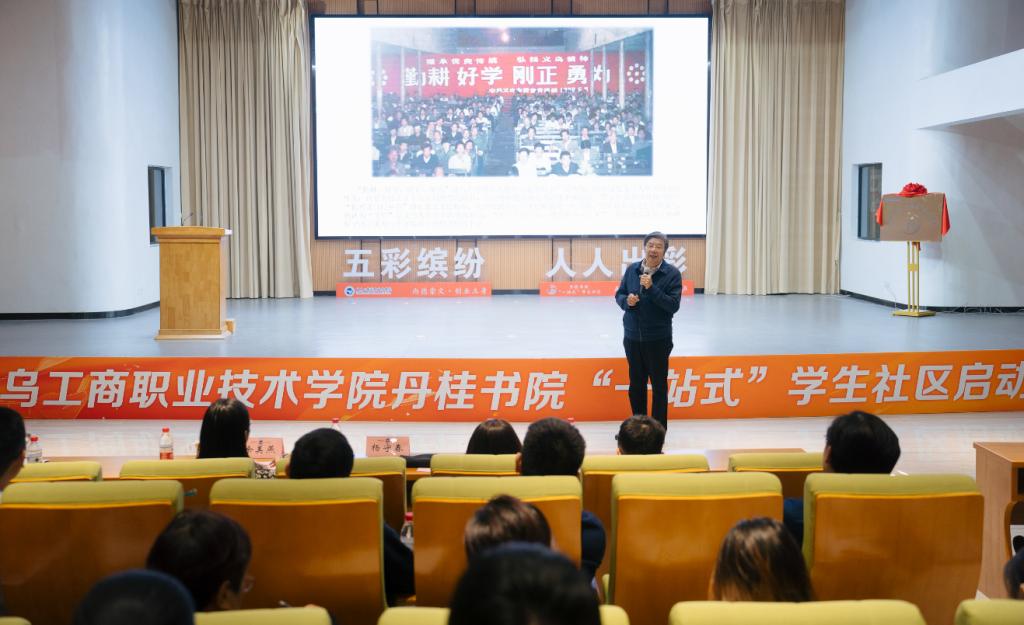 2023年10月27日,机电信息学院特邀校外人生导师、原金华市副市长、金华市委常委兼宣传部部长、金华市人大常委会党组副书记、副主任,现浙中书法院院长、金华市书法家协会顾问杨守春参加丹桂书院“一站式”学生社区启动仪式,为师生们带来了一场关于“义乌精神”的主题报告。杨守春,义乌上溪人,1975年从安徽部队退伍回乡后,曾经担任农村生产队长、公社电影放映员、上溪团委书记,1978年5月选调进入义乌县委办公室,1984年1月在全国干部“四化”浪潮中有幸成为中共义乌县委常委、宣传部部长。