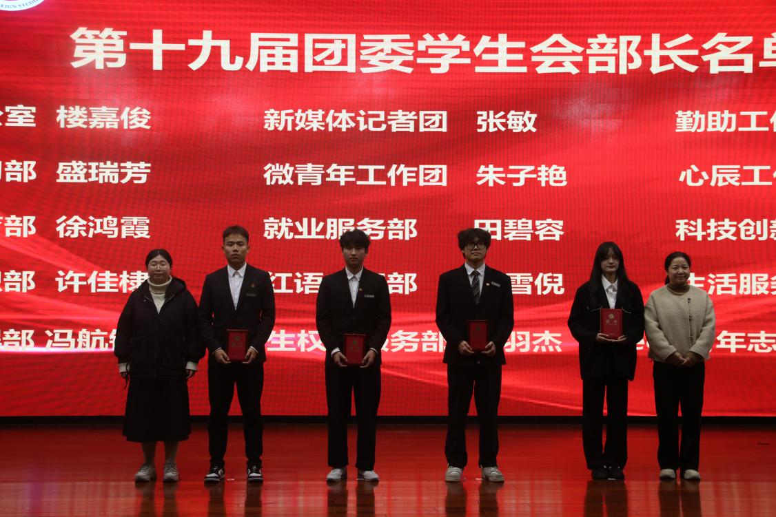 辅导员传帮带情,铸聘一书表丰功。全体辅导员老师为第十九届团委学生会部长颁发聘书,感谢他们为学院做出的贡献。各部长的聘书,犹如铸就的荣誉勋章,彰显着他们的辉煌成就,象征着荣誉的传承,也是对学生干部们辛勤付出的认可,外语外贸学院的传统与精神在每一个细节中得到了体现。