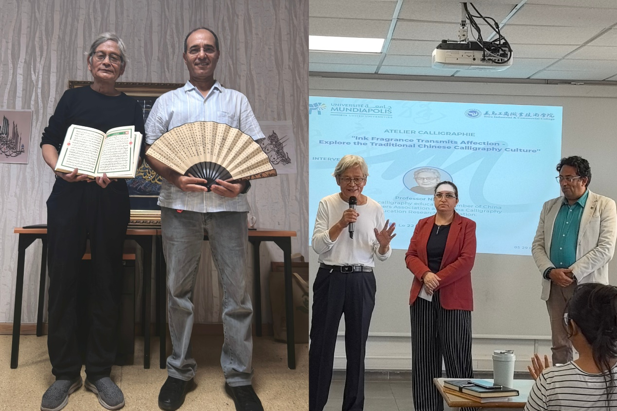 【摩洛哥,卡萨布兰卡】当地时间10月22日摩洛哥义乌商学院的校园里,一场主题为“墨香传情——体验中国传统书法文化”的交流活动拉开帷幕。此次活动特邀国内知名书法教育家、我校国际学生第二课堂书法教师南峰先生,为师生们带来了一场书法文化的盛宴。南老师到访期间,受到了合作院校巴尔卡维校长、穆查拉布副校长,法学院阿里教授的热情接待。在该校两个校区相继举行的两场活动中,吸引了合作院校蒙迪亚波利斯大学数百名师生热情参与,现场气氛活跃,墨香四溢,中国传统文化魅力引起了广泛的共鸣。