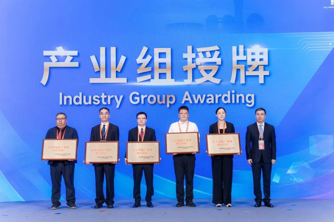 会上,数贸会数字贸易人才智力合作专委会五大领域产业组组长单位正式授牌。凭借在跨境电商领域的教学实践与产教融合成果,学校成功入选跨境电商产业组组长单位。创业学院负责人代表学校接受“跨境电商产业组组长单位”授牌,不仅彰显了学校在跨境电商领域的专业特色与行业影响力,更强化了学校在数字贸易人才培养生态中的枢纽作用。跨境电商产业组阵容强大,组员单位涵盖高校、企业、行业协会、科研机构等8家单位,旨在整合资源、协同创新,共同探索跨境电商产业发展的新模式、新路径。