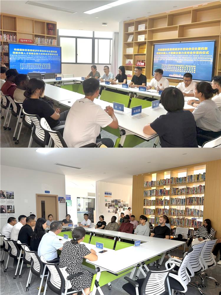 10月17日,“构建国际贸易领域涉外劳动争议处置机制,调解仲裁人才保障及智力支持合作协议”签约仪式在学校国际创客园举行。此次活动由我校国际教育学院承办,义乌市人社局劳动人事争议仲裁院院长刘晓坚、副院长王晟,中国计量大学现代科技学院人文与法学学院院长乔浩风、副院长蒲芳,我校外语外贸学院、国际教育学院党组织负责人和两校相关教师代表,以及十余名国际学生和创业校友代表参会。