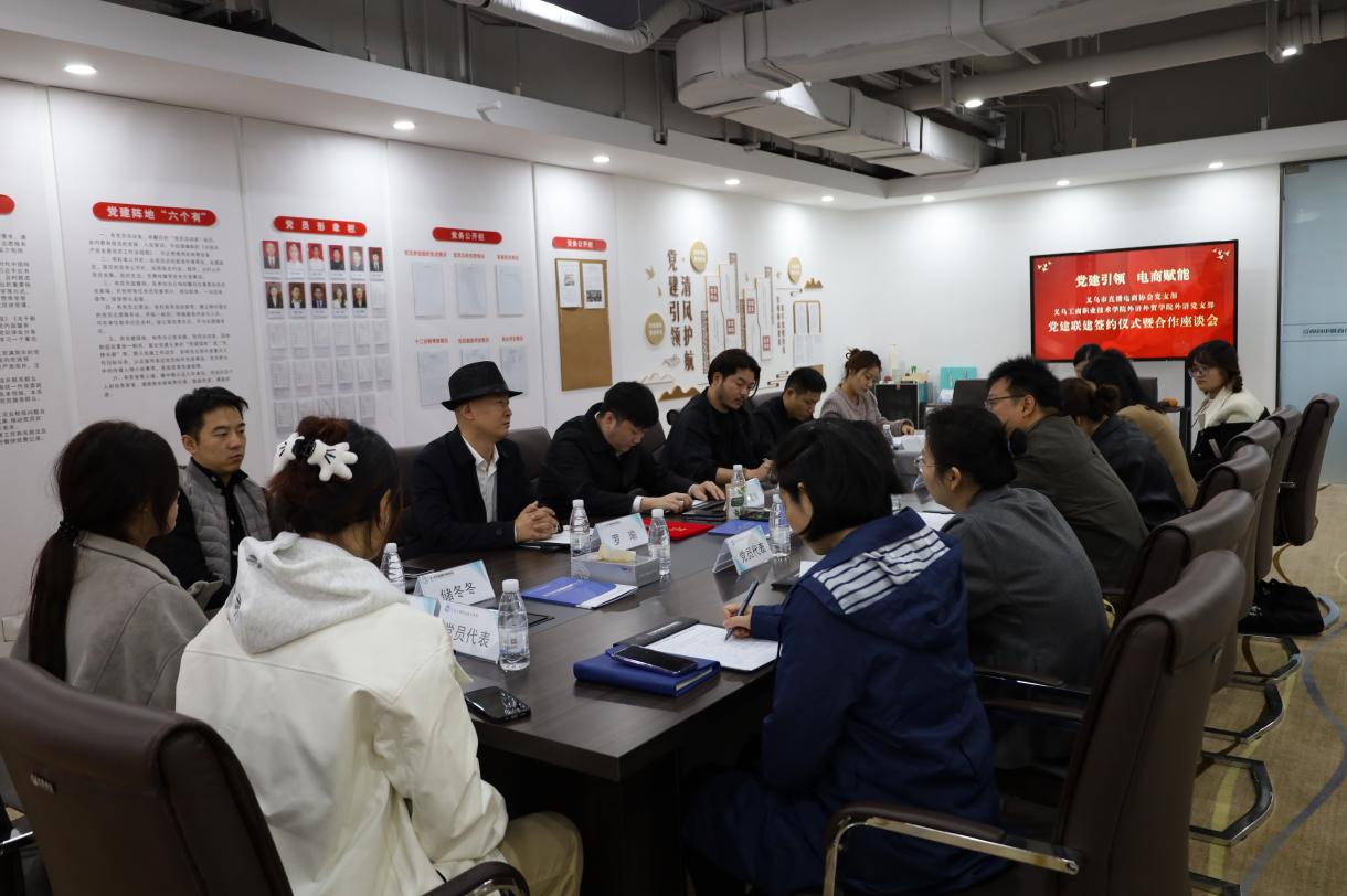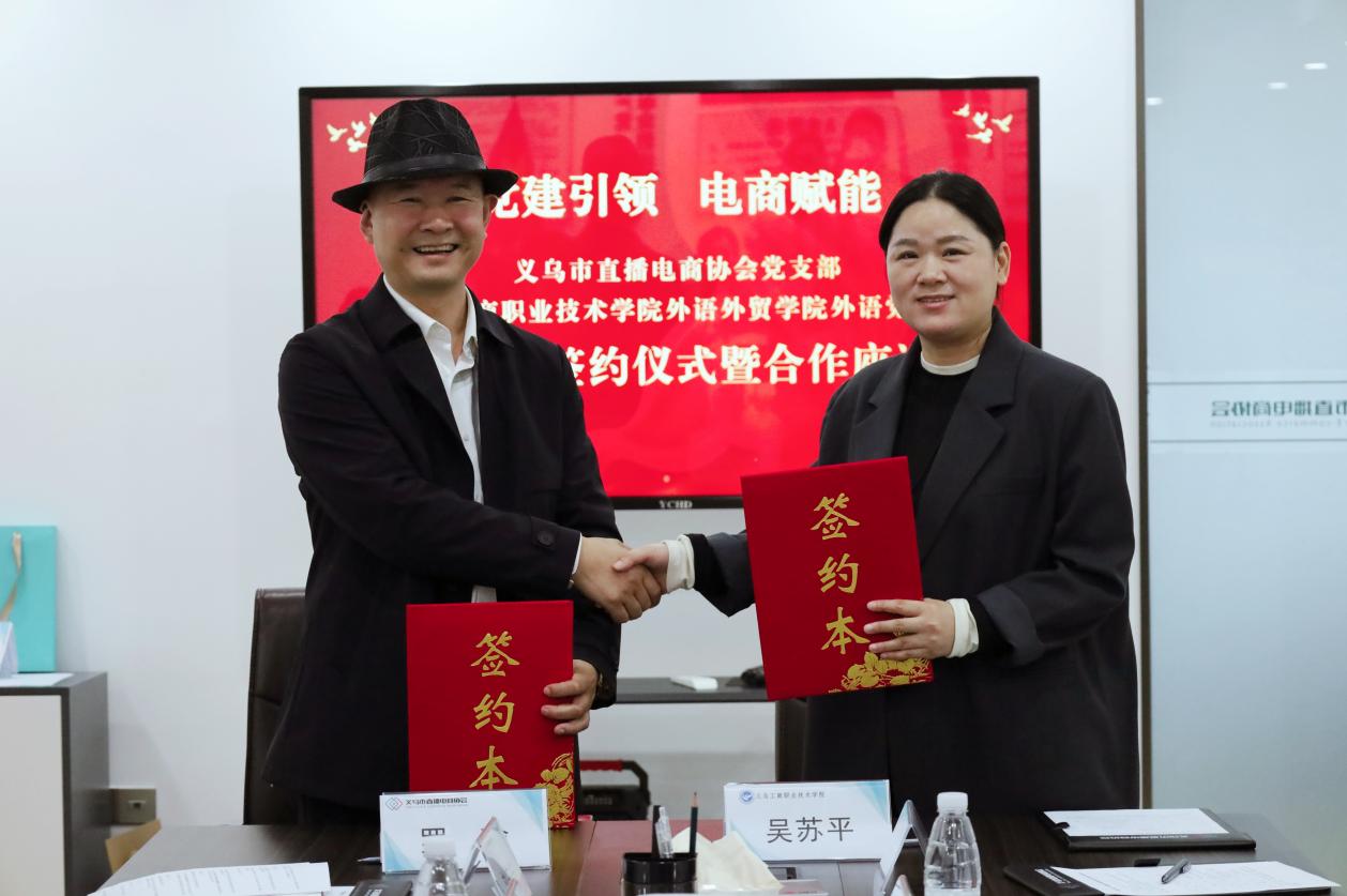为深入贯彻落实新时代党的建设总要求,推动基层党组织优势互补、协同发展,11 月 12 日上午,义乌工商职院外语外贸学院外语党支部与义乌市直播电商协会党支部在协会数字大楼举行 “党建统领,电商赋能” 党建联建签约仪式。义乌市直播电商协会党支部负责人及协会主要领导、党员代表,外语外贸学院党委相关负责人及外语党支部党员师生代表共同出席活动。