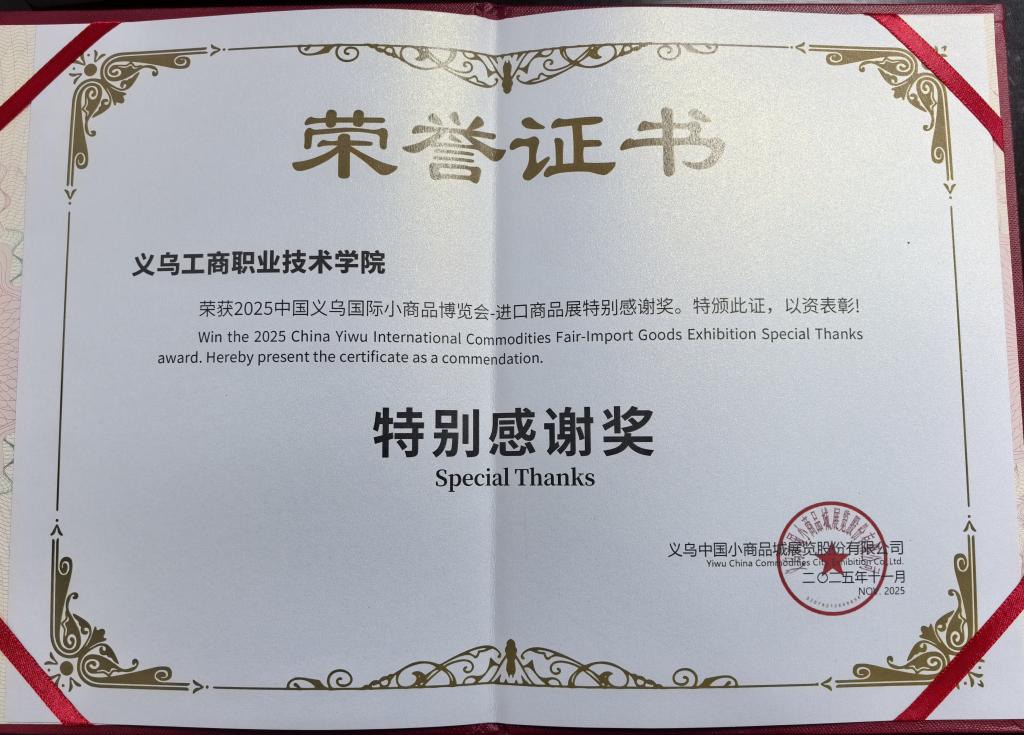 学生在此次展会中展现出极强的责任感、专业能力和服务意识,获得了主办方与参会客商的一致好评。此次获颁“特别感谢奖”,不仅是对学生们出色表现的肯定,也是对义乌工商职业技术学院“实战育人”教学理念的充分认可。