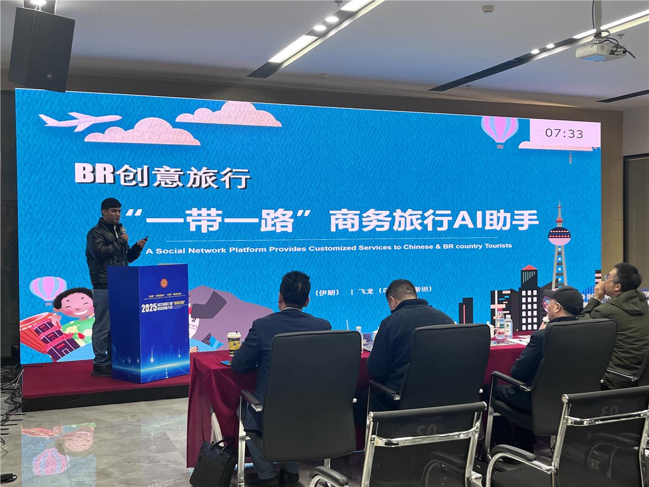 该项目负责人大山是我校 2022 届毕业生,目前为浙江科技大学研二学生。他带领团队研发的 “一带一路商务旅行 AI 助手”,凭借 “懂语言、懂文化、懂路线、懂商务” 的四维解决方案,精准贴合跨境商务旅行的实际需求,赢得评委一致认可。