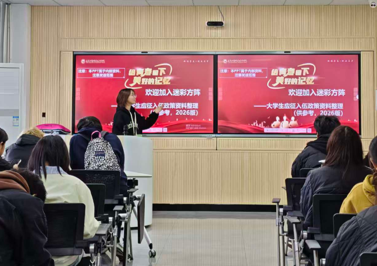 学院组织各班级召开了“携笔从戎,无上光荣”主题班会,通过PPT宣讲、播放征兵宣传片、分享微学工“戎耀青年修炼手册”及“戎耀故事汇”等系列推文,向全体同学宣传普及征兵优惠政策,如学费补偿减免、免试专升本等,对应征报名的基本流程和注意事项做了详细解读,鼓励现场有参军意向的同学大胆去尝试,积极在全国征兵网应征报名,并坚持锻炼身体,为参军做好充分准备。一位有参军意愿的男同学表示:这些形式多样、内容丰富的政策宣传让我们对军营生活有了更直观的认识,也提升了我们的综合素质。