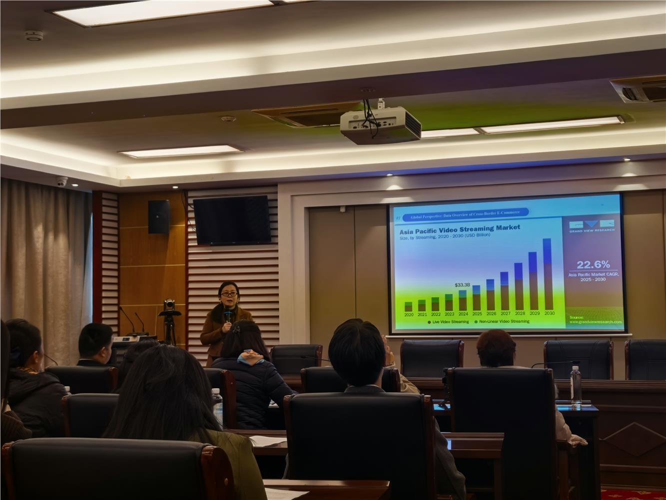 培训主讲人为外语外贸学院创业导师熊艾莎。在为期半天的课程中,熊艾莎老师系统梳理了全球及中国跨境电商的发展现状与驱动逻辑,并重点以“义乌模式”为样本,向泰国企业家们阐释了这座国际商贸名城如何通过高效的物流网络、完整的产业链支撑、数字化的营销创新,成功将小商品销往全球。课程后半程聚焦“数字破局”,详细讲解了跨境直播、短视频内容营销等前沿实战策略,为泰国企业借助新业态开拓市场提供了具体指引。