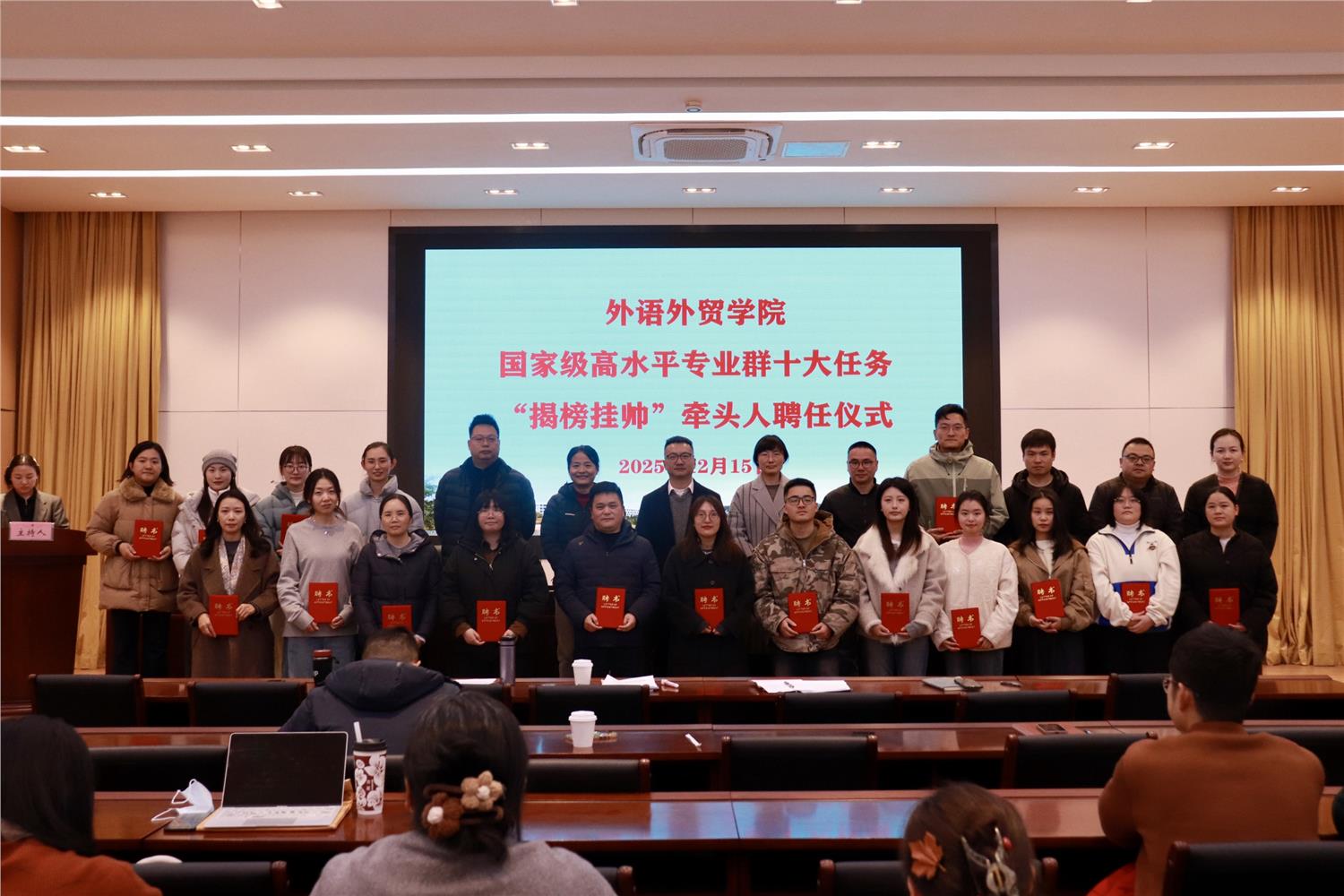 12月15日下午,外语外贸学院在文美厅召开国家级高水平专业群十大任务“揭榜挂帅”牵头人聘任仪式。外语外贸学院党政领导班子、全体教职工及学生代表参加。