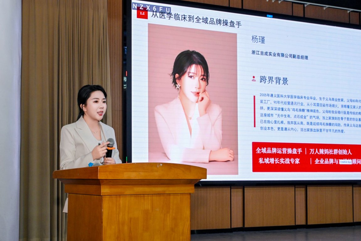 第二阶段义乌市女企业家协会会长大讲堂由浙江吉成实业副总经理杨瑾以《从“看见”到“点燃”:女性创业者的韧性、利他与共生之路》为题作精彩分享。杨瑾结合自身20年跨界创业经历,从实体通讯、社交营销、微商操盘到品牌运营,分享了对女性创业的深刻洞察。她提出:“生意的核心从来不是产品,而是信任;客户不是冰冷的流量数据,而是一个个需要被真诚对待的人。”同时,她深情讲述了浙江吉成实业有限公司董事长刘巧玲从19岁借款4000元创业起步,历经失败与挫折,最终带领企业实现跨越式发展的感人故事。