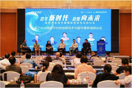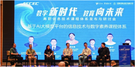 第四单元圆桌论坛,主要研讨如何将通用人工智能技术引进数字素养导向的信息技术课程体系。这一环节由全国高等院校计算机基础教育研究会高职电子信息专委会副主任兼秘书长盛鸿宇教授主持,特邀浙江机电职业技术学院智慧交通学院院长倪勇教授、武汉软件工程职业学院计算机学院副院长鄢军霞教授、科大讯飞高教人才培养业务产教融合总监吴然、微软中国教育团队市场发展总监姚振宁、百度高校合作部高级经理赵佳明参与。专家们就ChatGPT、文心一言、通义千问、讯飞星火、盘古等AI大模型的推出对各行各业的影响,对公民数字素养会产生什么新内涵要求,以及对高职(本专科)信息技术与数字素养课程体系和课程内容带来什么新变化等进行研讨,在学术交流中碰撞思想,在沟通中凝聚共识。圆桌论坛以新颖的主题、生动的研讨和主持吸引了参会代表们的注意力。