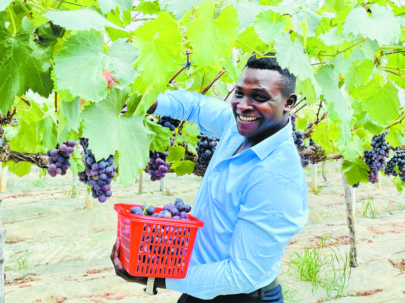距离“山里云销”中心不远的田间,有一处十几亩地的葡萄园,一串串红紫的夏黑提子挂满枝藤,不少游客慕名前来采摘购买,这也拓宽了夏黑提子线下销售途径。“听说采摘和我的肤色一样的提子,一定好吃。”来自非洲马里的外商斯迪卡一边小心翼翼地采摘提子,一边幽默地说道,逗得其他游客捧腹大笑。斯迪卡来义乌10年了,两年前从义乌工商职院毕业后留在义乌经商,听说赤岸提子熟了,他迫不及待前来尝鲜,还打算买一些带回公司。