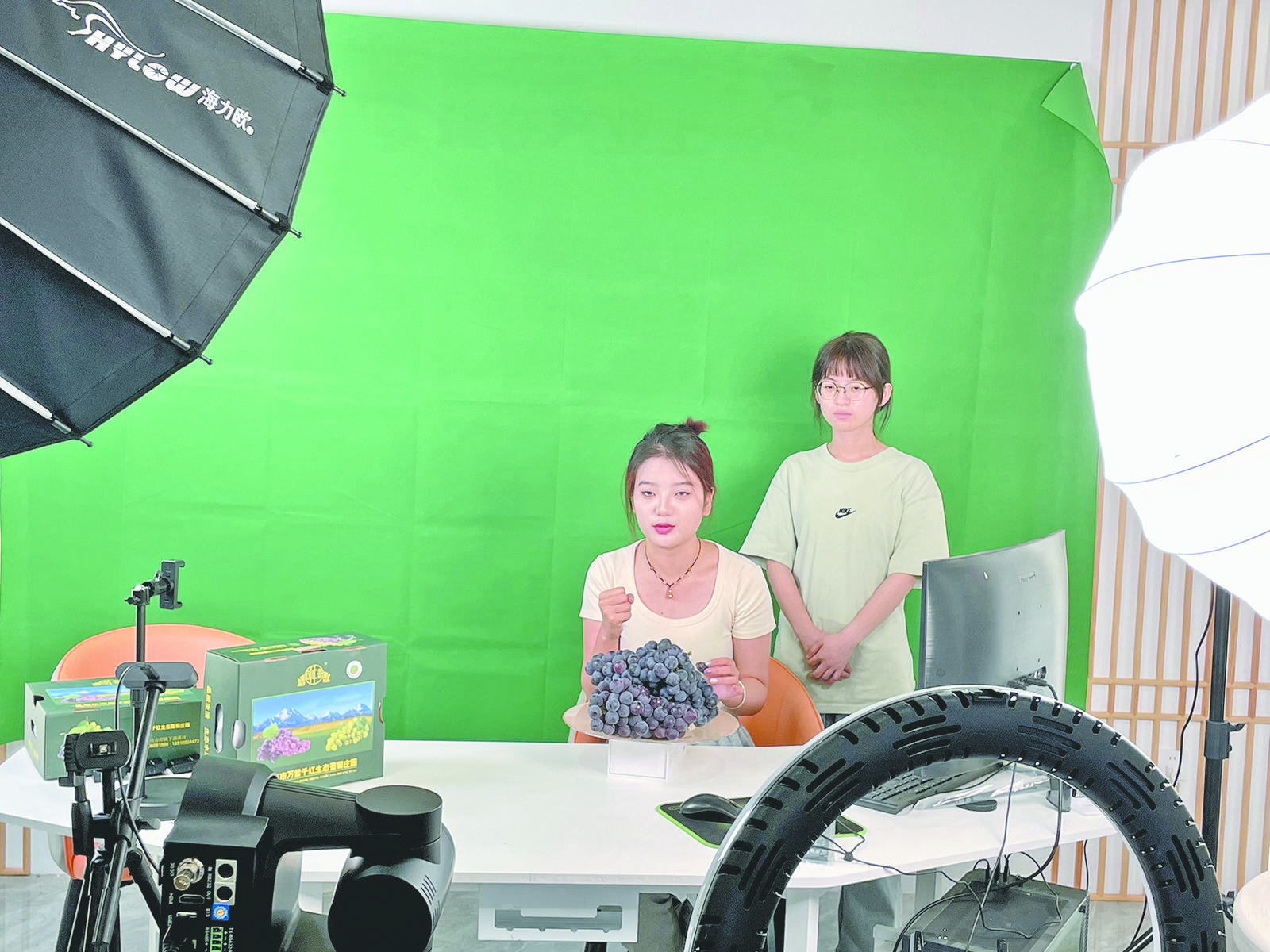 “大家抓紧抢购,首批大棚夏黑提子成熟了,但产量有限,卖完就要等下一批,来,三二一,上链接。”6月26日上午,赤岸镇清溪村“山里云销”中心直播间内,来自义乌工商职院的学生马景芮正在直播销售夏黑提子。她手上拿着的夏黑提子果实圆润,色泽饱满,一时吸引不少网友进入直播间观看并下单。