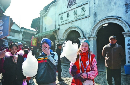 来自北欧的小客人被义乌市佛堂老街的棉花糖“甜”到了