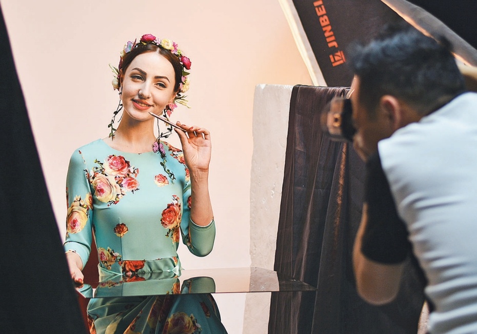 来自乌克兰的模特卡佳在义乌拍摄眉笔广告