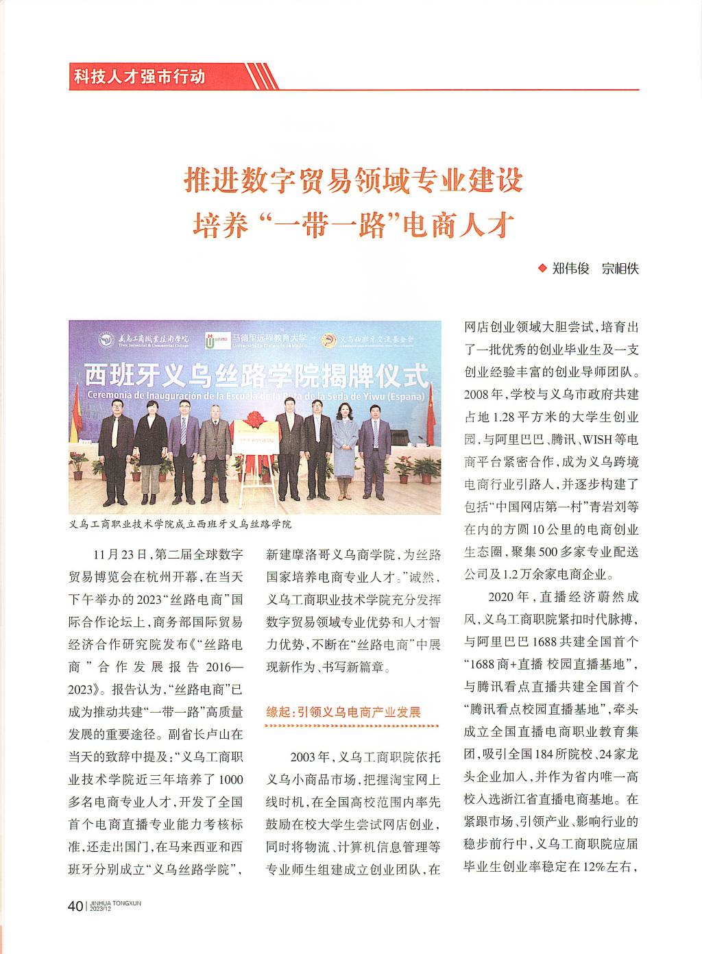 11月23日,第二届全球数字贸易博览会在杭州开幕,在当天下午举办的2023“丝路电商”国际合作论坛上,商务部国际贸易经济合作研究院发布《“丝路电商”合作发展报告2016—2023》。报告认为,“丝路电商”已成为推动共建“一带一路”高质量发展的重要途径。副省长卢山在当天的致辞中提及:“义乌工商职业技术学院近三年培养了1000多名电商专业人才,开发了全国首个电商直播专业能力考核标准,还走出国门,在马来西亚和西班牙分别成立‘义乌丝路学院’,新建摩洛哥义乌商学院,为丝路国家培养电商专业人才。”诚然,义乌工商职业技术学院充分发挥数字贸易领域专业优势和人才智力优势,不断在“丝路电商”中展现新作为、书写新篇章。