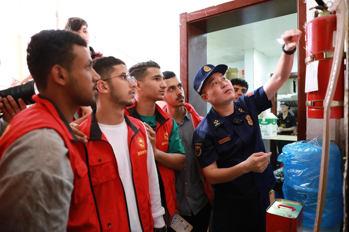 “小联合国”服务分队在义乌市消防救援支队消防监督人员带领下检查灭火器 义乌消防供图