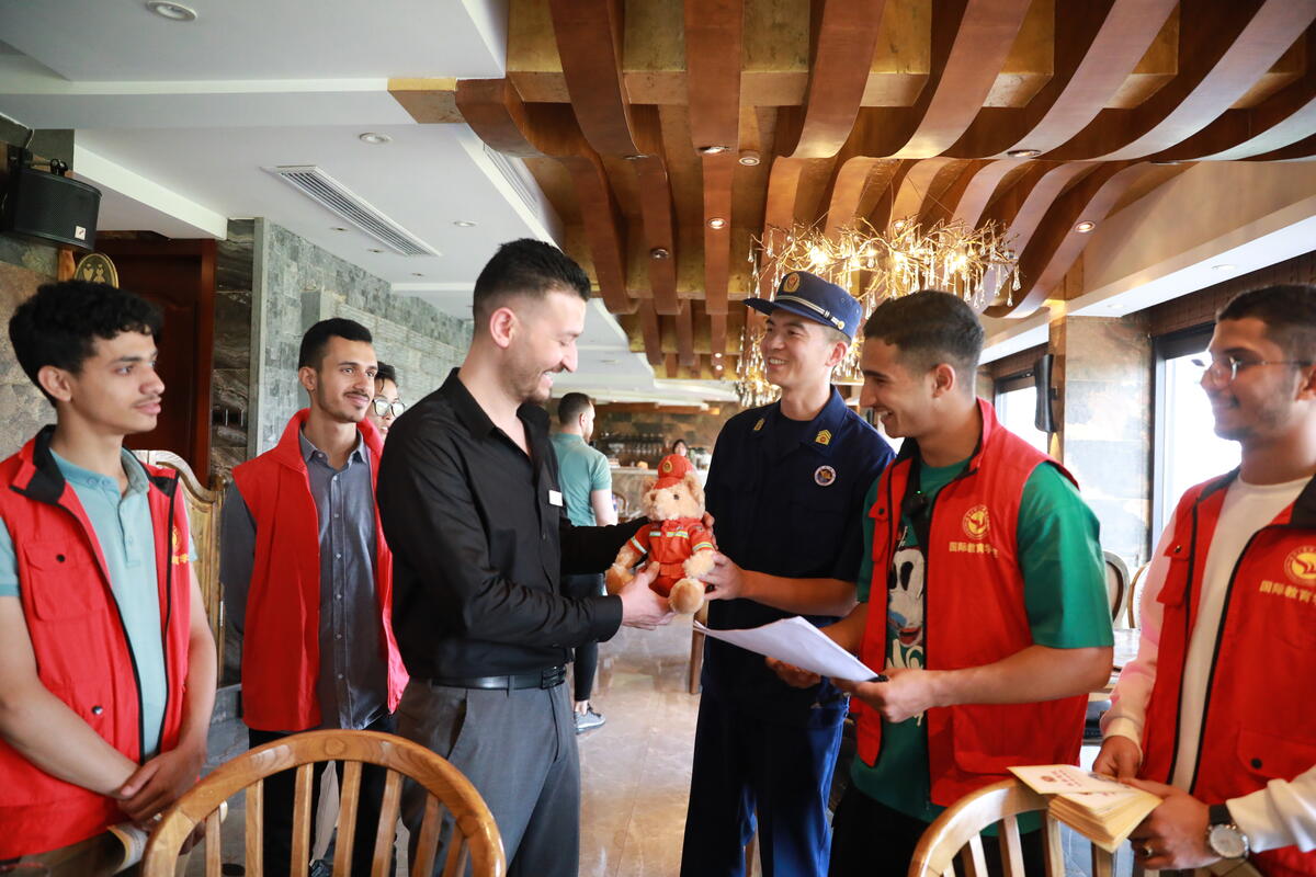 来自也门的阿民于一年前来到义乌从事进出口贸易,目前正在义乌工商职业技术学院学习中文,是国际消防志愿者服务队中的活跃分子,得知消息他第一时间报了名。在贝拉餐厅,以阿民为代表的不同肤色的志愿者统一着红色马甲,向食客和餐厅工作人员发放中英双语消防宣传手册,与大家互动答题,送上消防主题公仔,并仔细检查灭火器、消火栓、疏散通道是否符合要求。