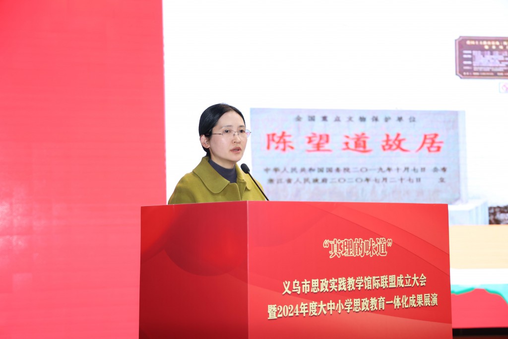 李昌祖在致辞中对出席活动的各位领导、嘉宾表示热烈的欢迎。他回顾了近年来义乌工商职业技术学院在思政教育一体化建设方面所取得的成就,并表示学校作为义乌市大中小学思政课一体化联盟理事长单位,深感责任重大、使命光荣。他指出,义乌市思政实践教学馆际联盟的成立,标志着义乌市在思政教育一体化建设征程上又迈出了坚实的一步。学校将进一步汇聚各方力量,共同探索思政实践教学的新路径、新方法,努力培养更多具有爱国情怀、创新精神和实践能力的优秀人才。