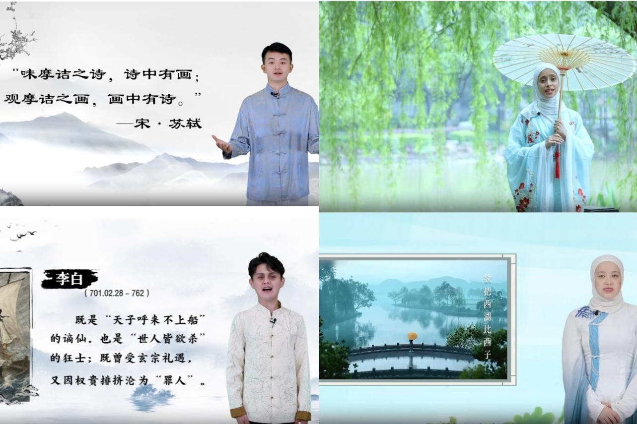 为了激发国际学生对中国诗词的深度理解与热爱、锻炼学生的口语表达能力,国际教育学院首次组织学生参与诗词讲解竞赛,包揽高职院校第一、第二名。四组选手以独特视角诠释经典。塔克尔(哈萨克斯坦)解析王维《山居秋暝》“诗中有画”的创作美学,苏莱曼(俄罗斯)突出表现了《行路难》中李白的倔强、自信和对理想的执着追求,洛菲达(也门)展现了《行香子·树绕村庄》中春光明媚、万物竞发的田园风光图,丽木(叙利亚)让我们看到了苏轼《饮湖上初晴后雨》中西湖的山水相依之美。