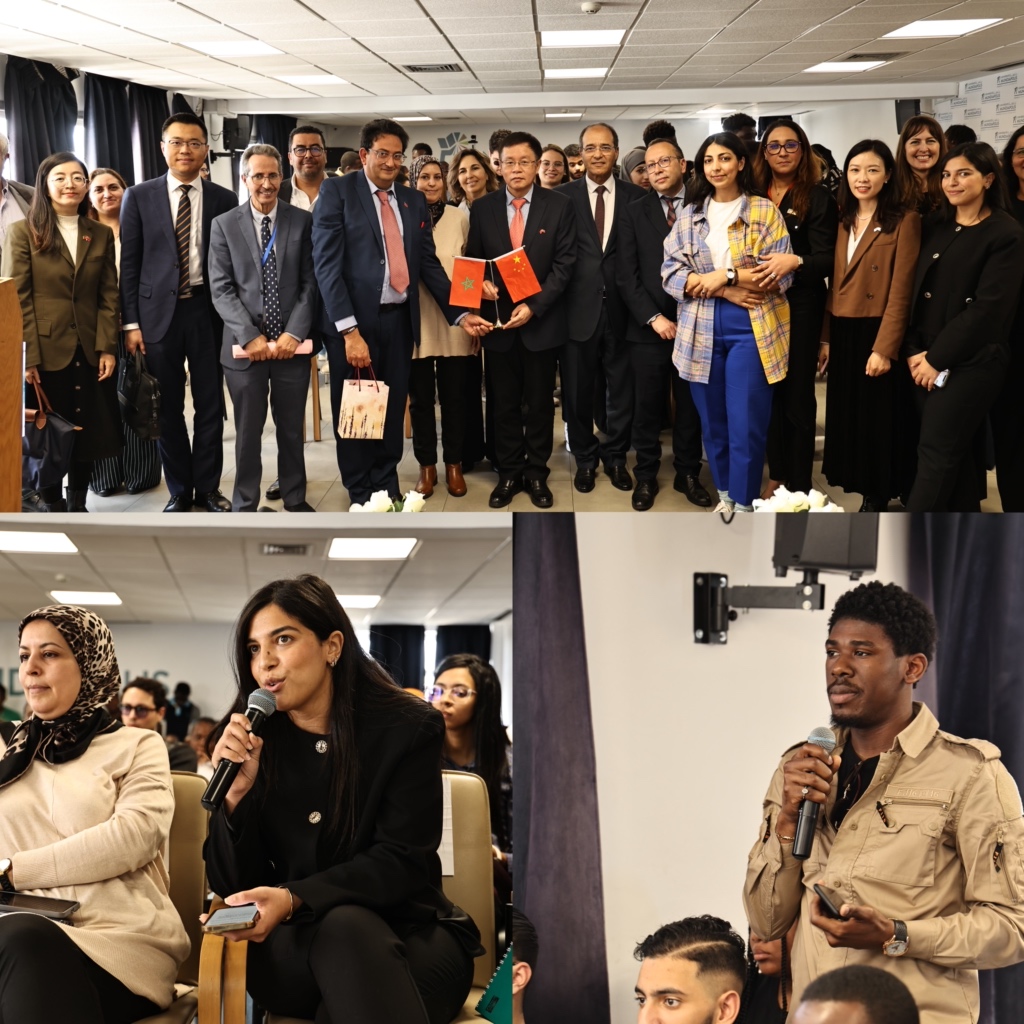 随后,李昌林大使亲切看望摩洛哥义乌商学院师生,就“新时代的中摩关系”为主题发表演讲。李大使以中摩友好使者伊本·白图泰的故事开篇,并结合个人外交工作经历,通过所见所感的鲜活事例,生动介绍了两国各领域交往的历史和现状。李大使表示,当前中摩关系处于历史最好时期,两国高层互访不断,中国已成为摩洛哥第三大贸易伙伴,中国企业投资摩能源和汽车领域积极性高涨,两国文化交流丰富多彩、文明互鉴走深走实。李大使勉励在场同学成为中摩友好使者,为中摩全方位合作注入新动力。李大使的精彩演讲赢得阵阵掌声,在场师生表现出高涨的热情。在互动环节,李大使还与师生就中非青年交往、扩大中文教育受众范围、赴华留学签证等问题进行了交流。